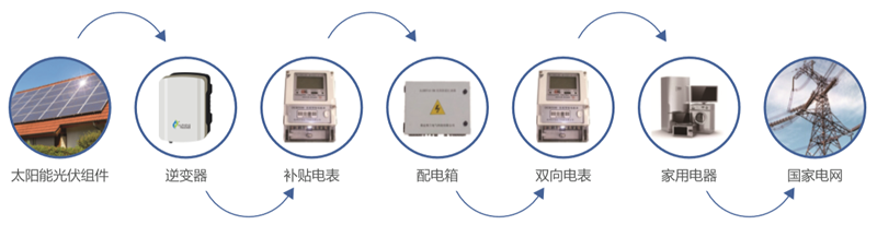 分布式太陽能電站與國家電網相連,共同承擔家庭供電任務,當有陽光時,光伏組件收到當地太陽光輻照產生電能,通過逆變器將其所產生的直流電轉化為日常家電使用的交流電,可以直接給家用電器使用,例如空調、洗衣機、冰箱等等,剩余電量上傳到國家電網,當太陽不足或自發電不夠用時,可直接使用國家電網以滿足用電需求。